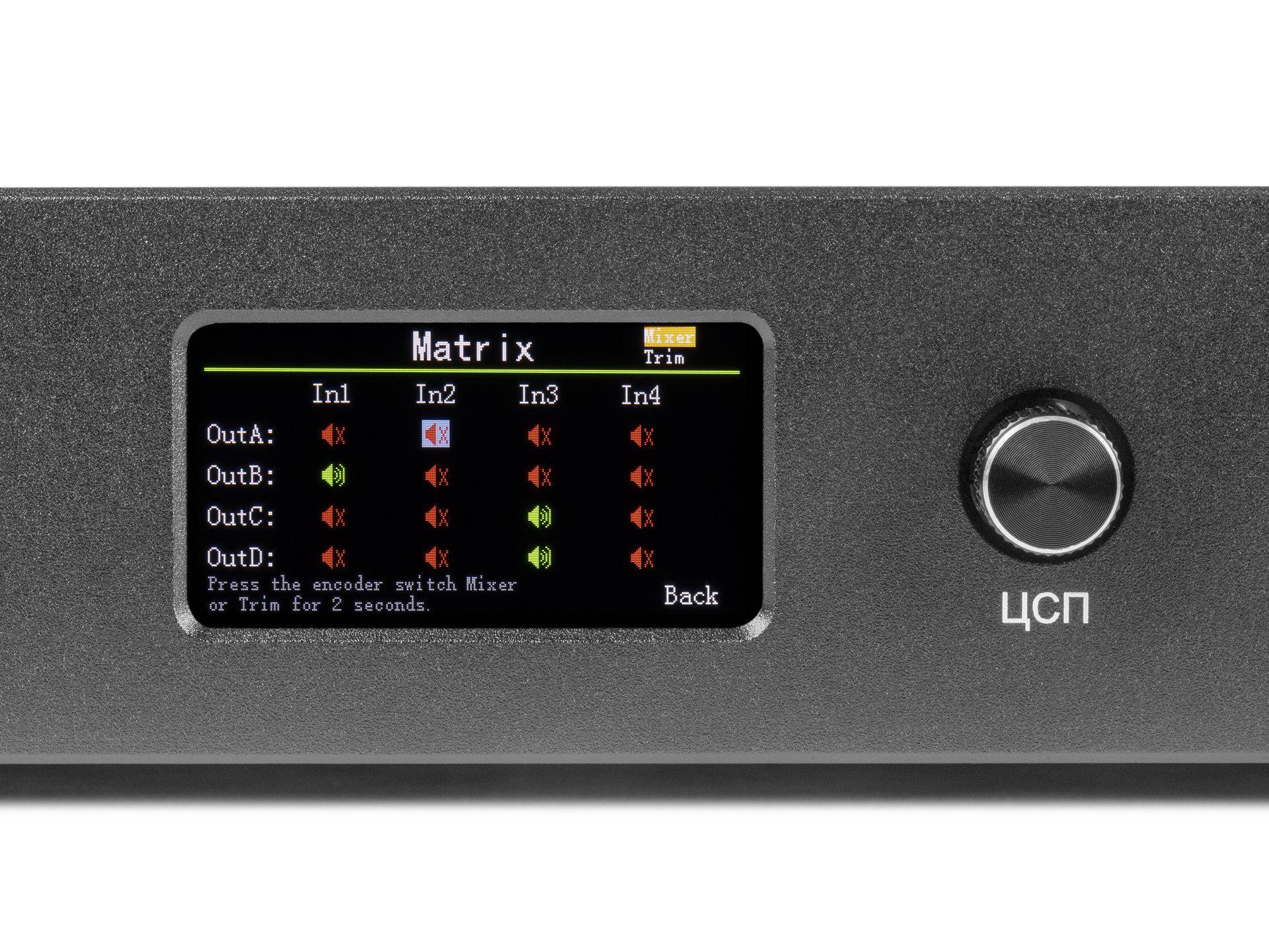 Встроенный сигнальный процессор позволяет настраивать параметры усилителя, в том числе загружать и сохранять до 40 предустановок для акустических систем.
