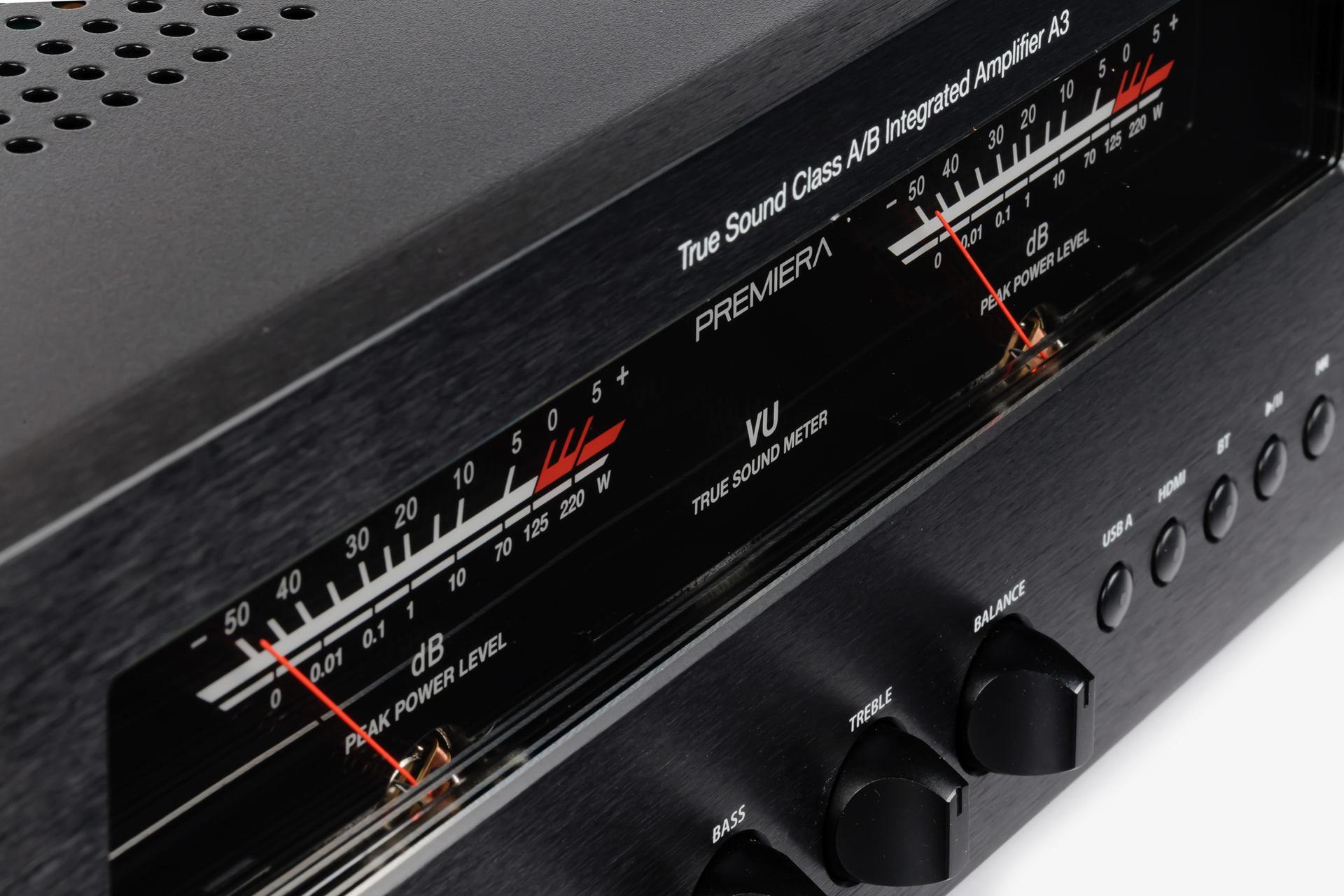 Premiera A3 – интегральный Hi-Fi стереоусилитель класса AB со встроенными ММ/МС-фонокорректором, ЦАП, Bluetooth, крупными стрелочными VU-индикаторами, HDMI ARC, USB, с номинальной выходной мощностью 110 Вт на канал (8 Ом), с возможностью подключения девяти источников входного сигнала (один вход - балансный) и двух пар акустических систем, четырьмя аналоговыми выходами - три стерео (для записи, регулируемый для внешнего усилителя и для наушников) и один моно (для активного сабвуфера).